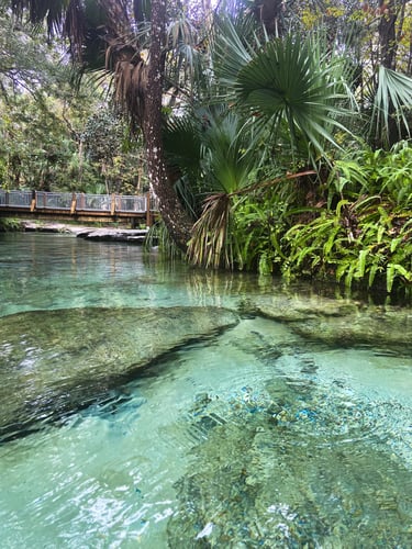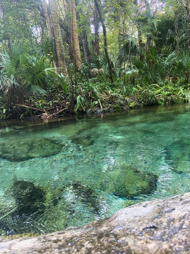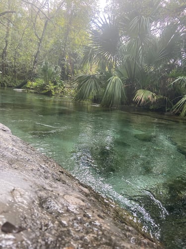To get to the start of the spring (pictured below for desktop view and above for mobile) walk pass the restaurant and follow the trail to the right. Do not cross over the bridge as it goes a different direction. Unfortunately we did not get a chance to explore this part of the park. Continue along the trail and you'll find multiple entry points into the water. We found that the easiest one to get into was at the very end. There are multiple flat rocks that you can sit on before fully submerging. Be careful getting in the current can be fairly fast, it won't take you very far though and you can stand in most places. We snorkeled from the start of the springs all the way to the large open natural pool (pictured below). The springs continue on past the open pool if you choose to float longer.